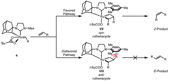 Computational and experimental studies were carried out to understand the Z-selectivity imparted by these cyclometalated catalysts [35,36]. The reaction is believed to proceed through a side-bound ruthenacyclobutane due to complex steric and electronic effects. Also, the cyclometalation locks the N-aryl group in place. Thus, it is postulated that the N-aryl group resides directly over the forming ruthenacylobutane, forcing all the substituents down in a syn-arrangement (Figure 3, VII). Cycloreversion furnishes a Z-olefin. For formation of the E-product, an anti-ruthenacycle (Figure 3, VIII) must form, which is sterically unfavored due to the N-aryl group blocking the top of the ruthenacycle.