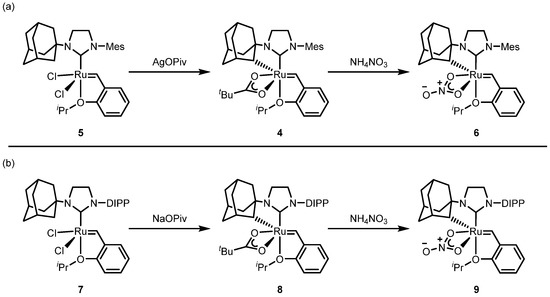 Building on these discoveries, the catalytic scaffold was tuned to enhance stability, activity, and selectivity. Initial variations were made to the X-type ligands on the ruthenium center [37]. It was found that monodentate ligands were unreactive. When screening various bidentate X-type ligands, it was observed that replacing the pivalate with a nitrate (Figure 4a) enhanced both the activity and selectivity (58% conversion and 91% Z in the CM of allylbenzene and cis-1,4-diacetoxy-2-butene) [37]. Further efforts to improve the cyclometalated catalyst focused on the free N-aryl group. It was found that replacing the N-Mes group with a more bulky N-2,6-diisopropylphenyl (DIPP) (9) greatly improved the activity and selectivity (Figure 4b) [38]. Using 9, the product of allylbenzene dimerization was obtained in >95% conversion and >95% Z.
