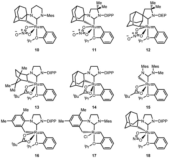 Efforts to improve the reactivity and selectivity of cyclometalated catalysts 6 and 9 have resulted in the preparation of novel cyclometalated complexes with varying carbene moieties including those with chelating N-substituents beyond N-1-adamantyl (Figure 5) [39,40,41]. The metathesis activity of these complexes was evaluated using standard terminal olefin homodimerization reactions of allylbenzene, 4-penten-1-ol, or methyl-10-undecenoate. Complex 10, possessing a 6-membered NHC, was found to be inactive in the test reactions [40]. Complex 11 showed good activity and retained high Z-selectivity in the homodimerization of allylbenzene, but it generated the undesired β-methylstyrene through isomerization of the olefin in the starting material [40]. Catalyst 12 displayed low to poor activity and modest Z-selectivity [40]. Complexes 13 and 14 both displayed good selectivity, but 13 showed superior activity to 14 [41]. Catalyst 15, bearing a four-membered chelate, showed little to no reactivity largely ascribed to catalyst instability [41]. Complex 16, the DIPP variant of 3, showed slightly higher selectivity and stability when compared to 3, which is thought to be a product of the sterically larger N-aryl DIPP [39]. Complex 17, containing a monodentate chloride ligand, was found to be E-selective [39]. It was postulated that the monodentate nature of the chloride ligand allows metathesis to proceed through a bottom-bound ruthenacycle, thus favoring E-products. Complex 18 featuring a nitrite X-type ligand displayed slower initiation rates in comparison to 9 [42]. Z-Selectivity was retained at longer reaction times where the nitrite catalyst could achieve similar conversions.