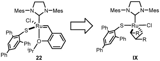 Early examples for Z-selective OM catalysts were based on Mo and W modified by monoalkoxide–pyrrolide ligands [60,61,62,63]. These catalytic designs built on the previously used scaffolds of the nonselective Mo and W catalysts. Grubbs and coworkers briefly looked at a catalytic system that employed a similar design to the nonselective ruthenium catalysts by replacing one of the chloride ligands with a sulfonate or phosphonate [31]. Because these catalysts were plagued by modest selectivities and showed low stability, this idea was shelved when the cyclometalated catalysts were discovered. Jensen and coworkers continued to build on the idea that a Z-selective scaffold could be similar to the traditional ruthenium metathesis catalysts. They performed a substitution on 1 to displace one of the chlorides with 2,4,6-triphenylbenzenethiol, forming 22 [64]. This very large X-type ligand can act as a barrier to one side of the catalyst, forcing all the substituents of the metallacycle to reside in a syn-arrangement, generating Z-olefins upon cycloreverison (Figure 6, IX). When assaying 22 in the dimerization of terminal olefins, it was found to deliver high Z-content at low conversion (Table 9). Unfortunately, isomerization problems persisted (Table 9, entry 1).