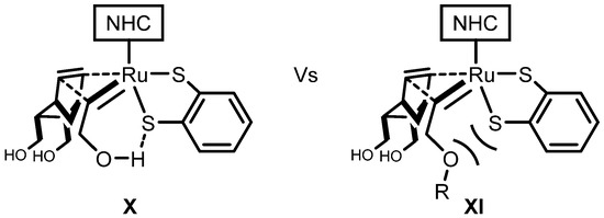 Until recently the only ruthenium-catalyzed Z-selective ring-opening/cross metathesis (ROCM) was substrate dependent and relied on complex catalytic design [70]. The dithiolate-based catalyst saw initial success in this relatively uncharted area [29,67,68]. Hoveyda and coworkers provided the first examples of ROCM involving styrenes (Table 10, entries 1 and 2). They continued pursuing the scope of this transformation to expand it to a variety of useful olefins including heteroaryl olefins (Table 10, entries 6 and 7) and dienes (Table 10, entries 8 and 9) as well as employing free alcohols on the norbornene (Table 10). It was noted that allyl ethers performed much poorer than the free alcohols as coupling partners in ROCM. It is proposed that there is a significant trans influence conveyed from the NHC to the axial thiolate, thus some electronic charge builds up on the thiolate. When employing a free alcohol as the coupling partner, hydrogen bonding can occur to dissipate the electron repulsion experienced by placing the oxygen and sulfur in proximity (Figure 10, X). If an allyl ether is used, no hydrogen bonding can occur, so the two heteroatoms experience repulsion and destabilize the ruthenacycle intermediate (Figure 10, XI).