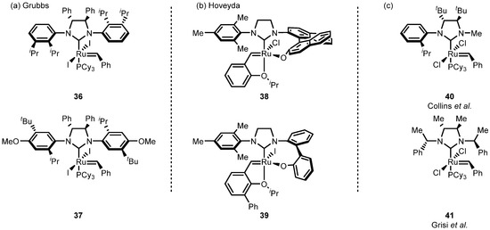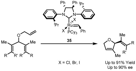 The first example of asymmetric OM using a ruthenium catalyst employed a chiral NHC ligand [71]. This catalyst performed a desymmetrization of achiral trienes through asymmetric ring-closing metathesis (ARCM), furnishing the cyclic products in high enantioselectivities (Scheme 3). Since this seminal work from Grubbs and coworkers, many studies have commenced with the goal of developing a more selective and efficient ruthenium metathesis catalyst for asymmetric OM [11,17,21]. There have been a variety of catalyst designs to address this issue (Figure 11). Subsequent reports from Grubbs and coworkers continued to use the gearing-effect of the NHC backbone to tailor the steric environment around the ruthenium catalyst (Figure 11a) [72,73]. The Hoveyda group employed C1-symmetric bidentate NHC’s that induced chirality at the ruthenium center to control orientation of olefin complexation (Figure 11b) [74,75,76]. Monodentate C1-symmetric ligands have also been studied in these processes (Figure 11c) [77,78]. The following sections on various asymmetric metatheses will focus on advancements made since 2010.