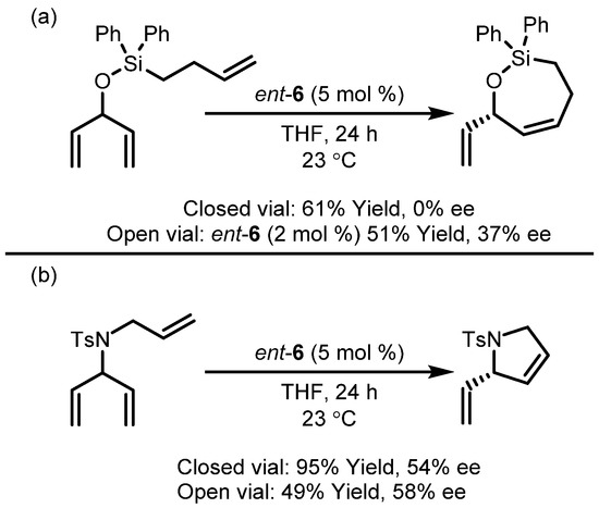 - Hartung, J.; Dornan, P.K.; Grubbs, R.H. Enantioselective Olefin Metathesis with Cyclometalated Ruthenium Complexes. J. Am. Chem. Soc. 2014, 136, 13029–13037. [Google Scholar] [CrossRef] [PubMed]
