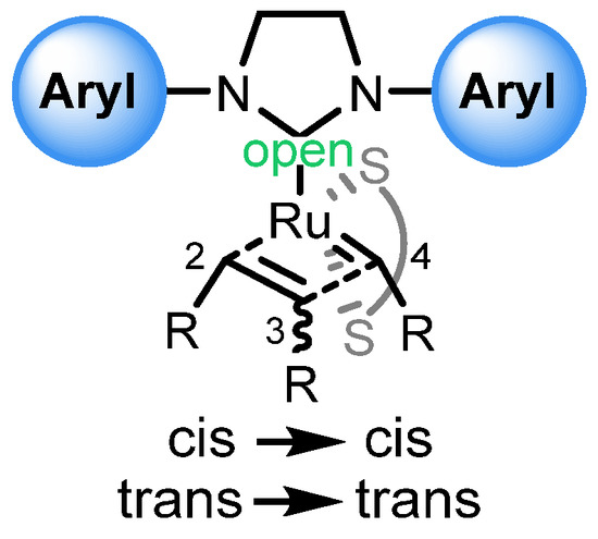 - Johns, A.M.; Ahmed, T.S.; Jackson, B.W.; Grubbs, R.H.; Pederson, R.L. High Trans Kinetic Selectivity in Ruthenium-Based Olefin Cross-Metathesis through Stereoretention. Org. Lett. 2016, 18, 772–775. [Google Scholar] [CrossRef] [PubMed]