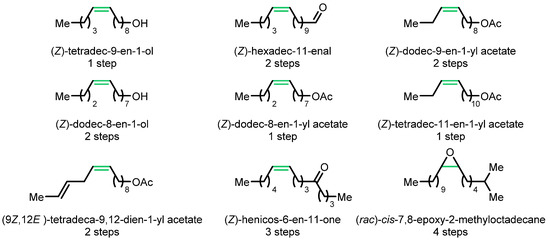 - Herbert, M.B.; Marx, V.M.; Pederson, R.L.; Grubbs, R.H. Concise Syntheses of Insect Pheromones Using Z-Selective Cross Metathesis. Angew. Chem. Int. Ed. 2013, 52, 310–314. [Google Scholar] [CrossRef] [PubMed]