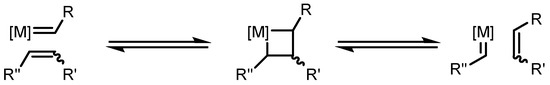 Organic molecules, by definition, are composed of carbon–carbon bonds; thus, their construction is central to strategies aimed at the formation of useful, complex products. One method that has found wide application in this endeavor is olefin metathesis (OM) [1,2,3,4,5,6,7,8]. Initially viewed as a strange olefin rearrangement reaction [9,10], the utility of OM now ranges from synthetic organic chemistry [11,12] to materials chemistry [13,14]. Studies on OM have further enhanced the understanding of this process, promoting the development of interesting and useful metathesis catalysts. The generally accepted mechanism was originally proposed by Chauvin and Hérisson (Scheme 1) [15]. Upon generation of a metal-carbene, an olefin can chelate to the metal species. [2+2] cycloaddition can occur, forming a metallacyclobutane, which can then cyclorevert, forming a new olefin and metal-carbene species.