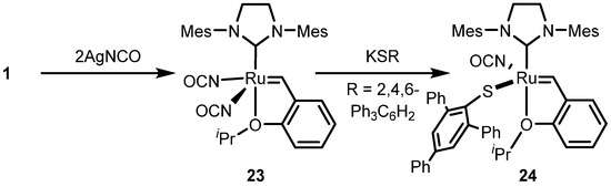 Expanding on early catalyst architecture which led to promising Z-selectivities at low conversion, the Jensen group replaced the remaining anionic chloride ligand with an isocyanate, affording 24 (Scheme 2) [65]. Initial head-to-head comparisons with the parent catalyst showed improved Z-selectivity at the expense of reactivity (Table 9, entries 2, 4, and 6). Interestingly, this new catalyst was found to be quite robust and, unlike 22, can be purified using standard chromatographic conditions (silica gel and unpurified solvents). Spurred by this finding, reactions conducted with 24 under air or in the presence of an acid under argon were shown to reduce the amount of isomerization observed in the starting material (chain-walking) and product (Z:E). Additional studies were aimed at understanding the effect of changing the identity of the donor ligand (NHC in 22 and 24). Phosphine supported, or first-generation, analogues of 22 (Figure 7) were prepared, characterized crystallographically, and studied computationally but generally demonstrated lower activities and Z-selectivities [66].