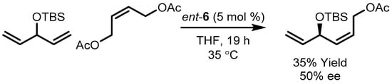 The ability of 6 to selectively react with terminal or Z-olefins, as was seen in the ethenolysis methodology, offered a platform to perform chemoselective OM on substrates containing multiple olefins. It was reported by Grubbs and coworkers that 9 was able to differentiate between terminal olefins and internal E-olefins with great discretion, providing 1,4-diene CM products in good yields with excellent selectivities (Table 7) [58]. Carbonyl and amine functionality was also tolerated (Table 7, entries 2–7). They also found that internal Z-olefins reacted preferentially to E-olefins and chemoselective RCM formed macrocyclic dienes.