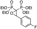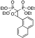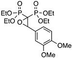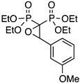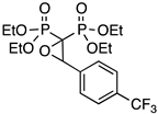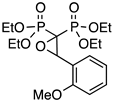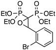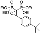 As a typical example, the 1H NMR spectrum of PPhO (see Supplementary Material, Figure S2) shows a series of features, namely: (i) a typical triplet at 4.69 ppm (3JH-P 5.0 Hz) attributed to the oxiranic proton coupling with two non-equivalent P atoms but with almost equivalent 3JH-P coupling constants; (ii) the signals attributed to the ester groups, i.e., the –CH2– multiplet at 4.0 ppm and four different signals for –CH3 at 1.41 ppm and 1.13 ppm due to the diastereotopic environments of the ester moieties derived by the presence of the stereocenter in the molecule; (iii) the 31P{1H} NMR spectrum showing two different doublets due to the diastereotopic environment of the P atoms. The mass spectrum (see Supplementary Materials, Figure S3) shows a very weak peak at 392 m/z corresponding to the molecular ion of the product, thus providing a further confirmation of the structure of the product.