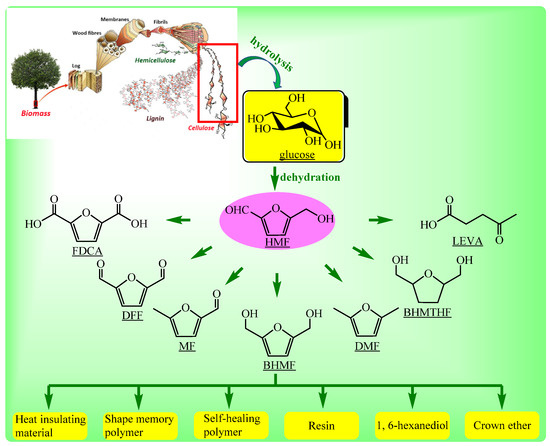 The development of efficient production technologies for biomass-based fuels and chemicals has received much attention [1,2]. In this context, 5-hydroxymethylfurfural (HMF), which was identified as a key precursor and called a “sleeping giant” for the synthesis of biofuels and high value-added chemicals, has been widely studied. As shown in Figure 1, HMF possesses two functional groups: an aldehyde and an alcohol, so it can be easily converted into value-added compounds to be used in a wide variety of chemical manufacturing applications and industrial products [3]. Importantly, HMF can be hydrogenated to 2,5-bis-(hydroxymethyl)furan (BHMF), which is a monomer for the synthesis of heat insulating material [4], resins, and crown ethers [5]. Moreover, BHMF is a promising diol that can be used either directly for the synthesis of shape memory and self-healing polymers or for the synthesis of 1,6-hexanediol, which is also an important polymer precursor [6].