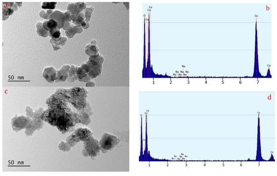 TEM images (a,c) and EDX (b,d) of the reduced and recycled Ru/Co3O4 samples.