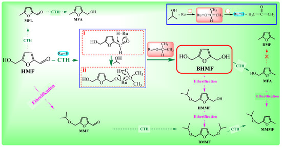 Proposed reaction pathways of the CTH of HMF to BHMF using the isopropanol and Ru/Co3O4 reaction system.