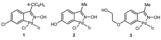 - Dupont, J.; Pfeffer, M. Palladacycles: Synthesis, Characterization and Applications; Wiley-VCH: Weinheim, Germany, 2008. [Google Scholar]
