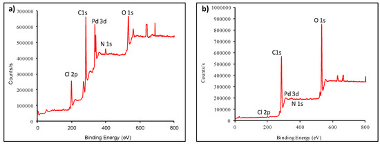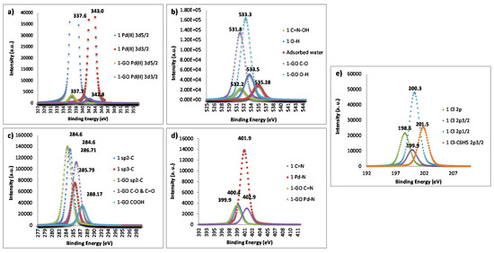 Figure 2 and Figure 3 show the XPS spectra of 1 and 1-GO where the spectroscopic signature of palladium, carbon, oxygen, and nitrogen atoms has been determined [71,72,73] Regarding palladium (Figure 3a), the Pd3d XPS spectrum for 1 and 1-GO showed the corresponding binding energies at 337.70 (3d5/2) and 343.02 (3d3/2) eV and 337.62 (3d5/2) and 342.83 (3d3/2) eV, respectively. These energies were assigned to the Pd(II) from the oxime palladacycle. On the other hand, O1s XPS analysis for catalyst 1 showed three different components related to the C=N–OH bond at 531.76 eV, the O–H bond at 533.5 eV and the C–O bond at 532.20 eV (Figure 3b). The higher content of the O–H and C–O groups in 1-GO (532.20 and 533.32 eV, respectively) can be associated with the corresponding groups on the graphene oxide surface. The carbonaceous material was also responsible for the higher content of the C=C/C–H aromatic ring binding energies (284.60 and 286.71 eV) in the C1s XPS spectrum of 1-GO when compared with 1 (Figure 3c). The N1s XPS spectra of 1 and 1-GO showed the N=C bonding energies at 400.36 and 399.93 eV, respectively. Furthermore, the peaks corresponding to the N–Pd moiety appeared at 402.86 eV for 1 and 401.93 eV for 1-GO (Figure 3d). Finally, the Cl2p XPS spectra of 1 was analyzed showing the corresponding binding energies at 198.6 eV (2p), 199.9 (2p3/2) and 200.3 eV (2p1/2). These energies were assigned to the Cl–Pd bonding energy from the oxime palladacycle 1. The band at 200.1 8 eV corresponded to the 2p3/2 aromatic–Cl bonding energy (Figure 3e) [63].