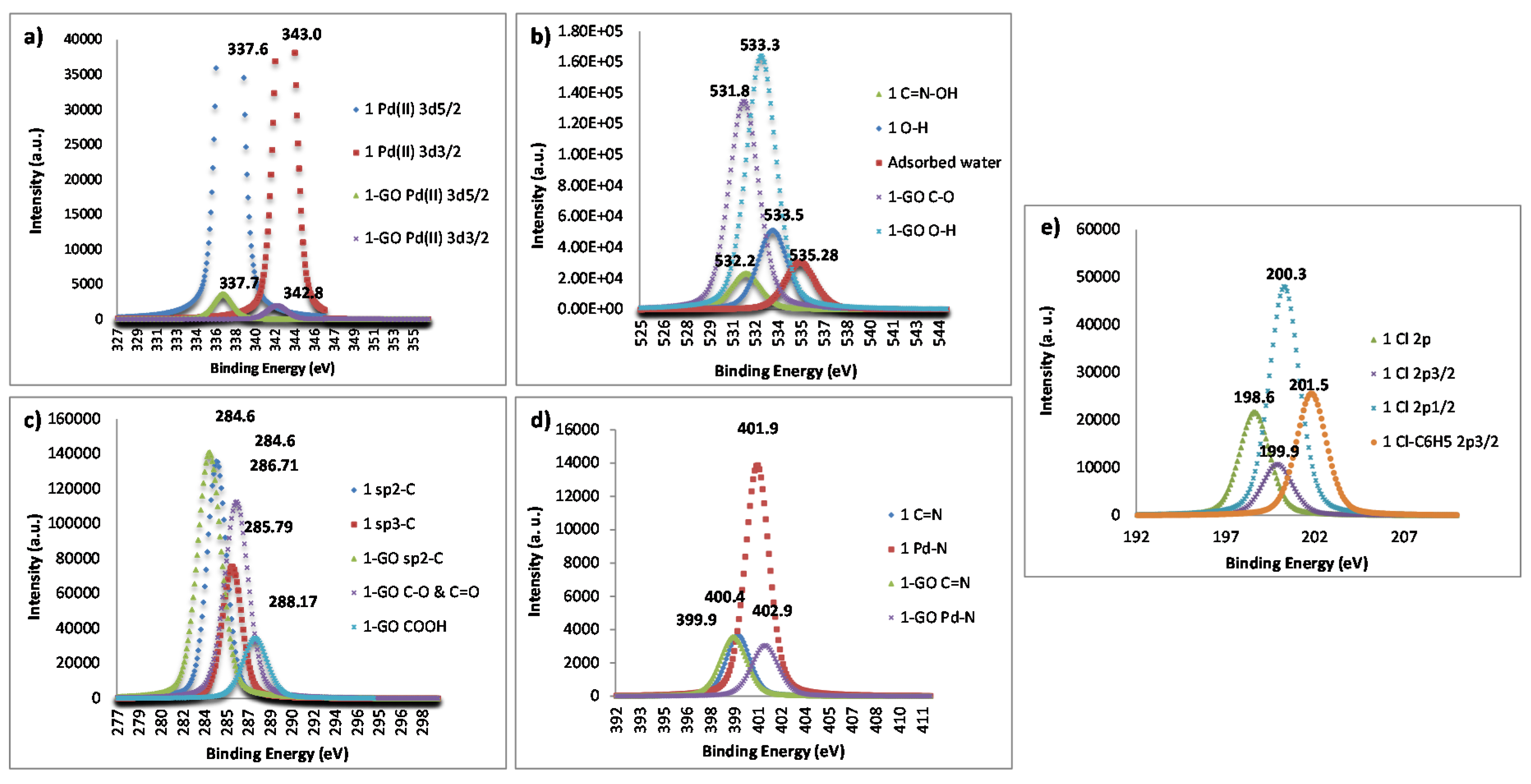 XPS spectra of 1 and 1-GO: (a) Pd3d; (b) O1s; (c) C1s; (d) N1s; (e) Cl2p, and deconvoluted peaks (%) for Pd3d, C1s, O1s, N1s and Cl2p core levels.