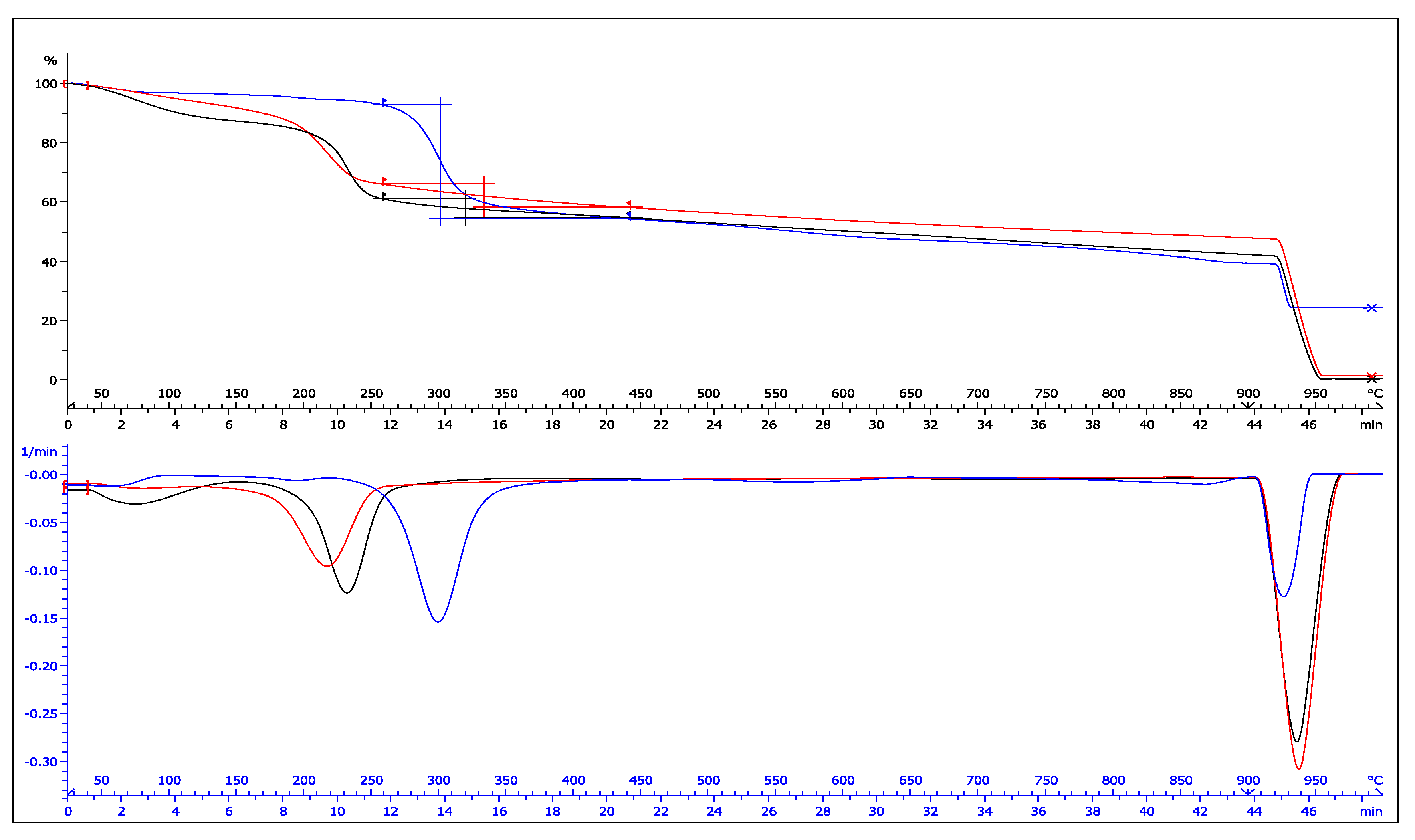 Thermogravimetric analysis (TGA) of 1 (line blue), GO (black), and 1-GO (line red) was next performed (Figure 4). As shown, palladacycle 1 presents a 39% mass loss below 300 °C which corresponds with the degradation of the 4,4′-dichlorobenzophenone oxime. On the other hand, regarding the support, GO exhibited around a 13% mass loss below 100 °C and almost a 27% loss at 210 °C resulting from the removal of the labile oxygen-containing functional groups and H2O. Finally, 1-GO exhibited a 28% mass loss at 200 °C due to the loss of the carbonaceous oxygenated species from GO and the loss of the organic ligand of the palladacycle. A final and significant common drop in mass was observed for the three materials around at 925 °C connected with the pyrolysis of the carbon skeletons (Figure 4). According to the TGA, the Pd content for catalyst 1-GO (measured over different material batches) was between 1.35% to 2% which slightly differs from the content obtained from the more accurate ICP-OES technique (1.10% Pd).