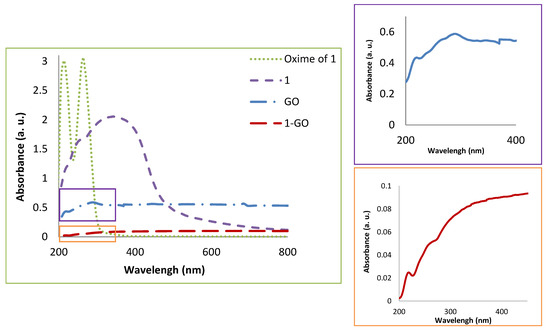 UV-Vis spectra of: 4,4′-dichlorobenzophenone oxime (EtOH solution), palladacycle 1 (solid state), GO (solid state), and 1-GO (solid state).