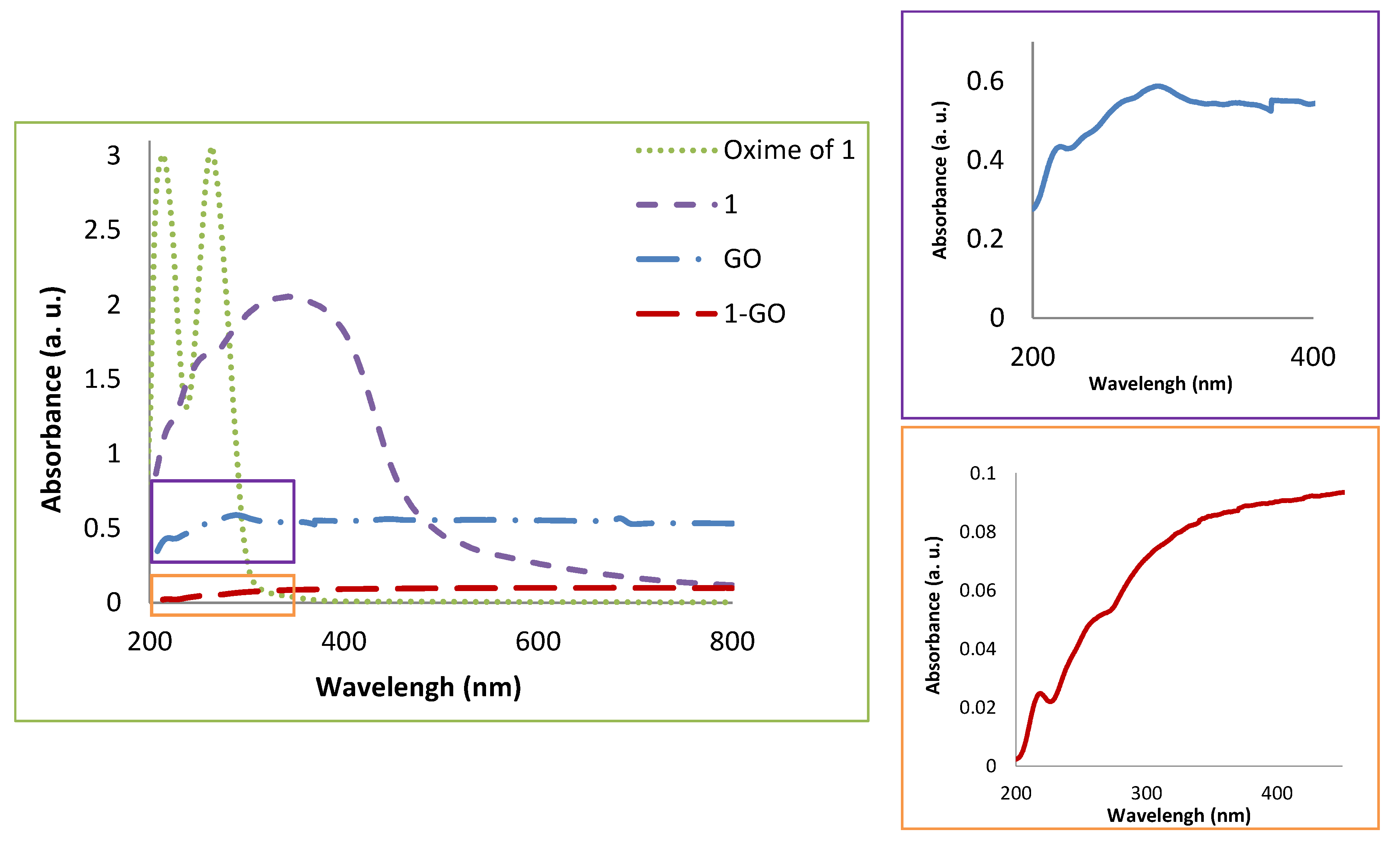 Catalyst 1-GO was also characterized by solid UV-vis spectroscopy. As depicted in Figure 5, 4,4′-dichlorobenzophenone oxime (EtOH solution) showed the characteristic absorption C band at 265 nm. This absorption band was slightly blue shifted to 261 nm for palladacycle 1, which also exhibited the specific metal-to-ligand charge transfer band at about 357 nm. As shown in the UV-vis absorption spectra, graphene oxide exhibited two absorption peaks, a maximum at 230 nm corresponding to π/π* transitions of aromatic C–C bonds, and a shoulder at 293 nm attributed to n/π* transitions of C=O bonds [74]. Finally, in the UV-vis spectrum of 1-GO, the absorption C band from the palladacycle at 262 nm could be detected (Figure 5).
