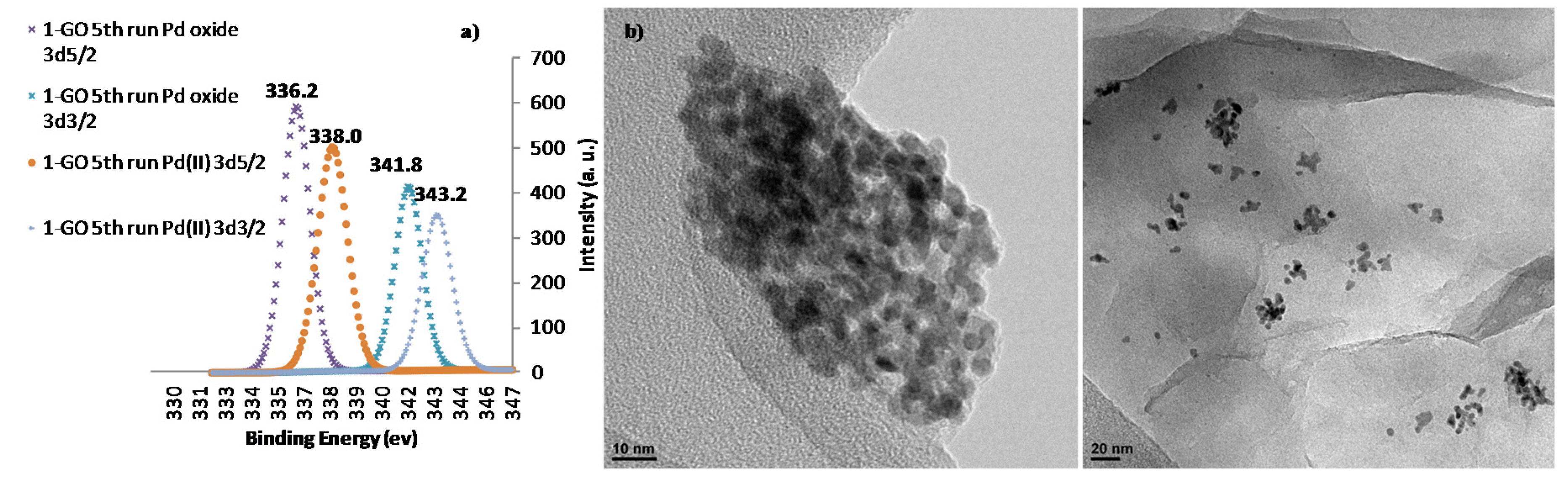 Analysis of 1-GO after five reaction cycles: (a) XPS Pd spectrum; (b) TEM images.
