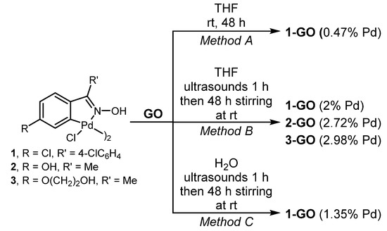 Thus, performing the palladation reaction using THF as solvent before immobilization onto GO led to the integral cyclopalladated species being supported. In fact, Pd(0) has been previously detected when anchoring oxime palladacycles to different supports such as, 3-hydroxypropyltriethoxysilyl-functionalized MCM-41 [17] and 3-(aminomethyl)pyridine-functionalized graphene oxide [63].
