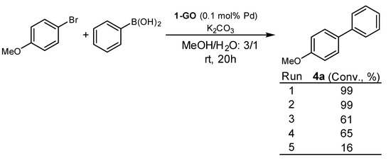 A simple recovery and reuse of transition-metal immobilized catalytic systems is highly desirable from both economic and environmental points of view. Therefore, a study of 1-GO recyclability was carried out on the model reaction, i.e., the coupling between 4-bromoanisole and phenylboronic acid using 0.1 mol % Pd as catalyst loading. After each cycle, the catalyst was easily separated from the reaction mixture by washing the crude reaction with a EtOAc/H2O: 1/1 solvent mixture and subsequent centrifugation (see SI, for details). As depicted in Scheme 2, catalyst 1-GO showed good catalytic activity for the two first reactions runs, decreasing the conversion of the reaction from the third cycle.