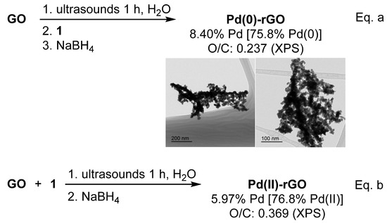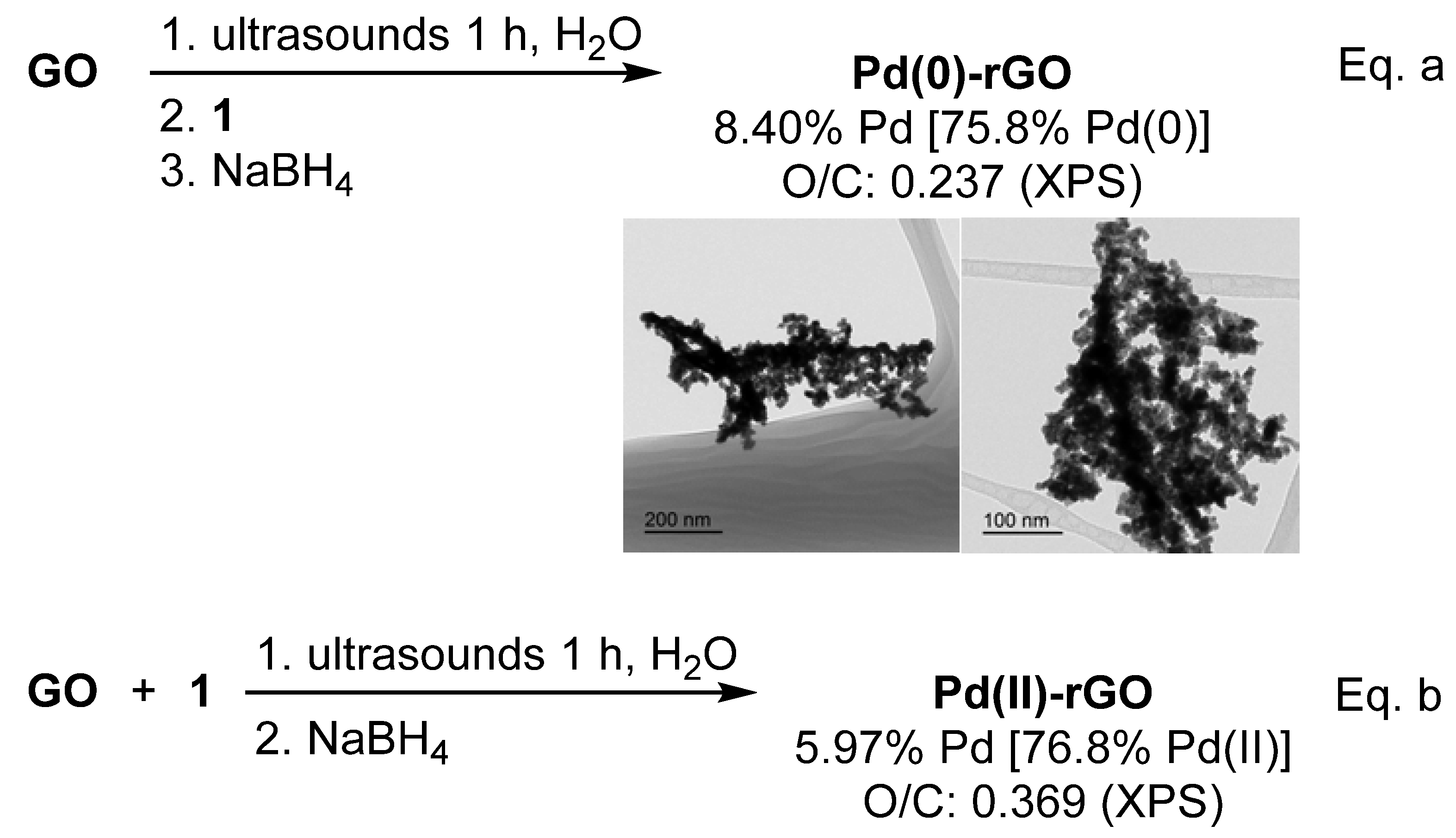 Oxime palladacycles are considered reservoirs of highly active palladium nanoparticles [66,67,68]. Usually, PdNps supported on graphene materials are prepared by reduction of a Pd salt or Pd catalyst in the presence of the corresponding carbonaceous support [45,46,47,48,49,50,51,52,53,54,55,56,57,58,59,60,61,62]. Then, we next turned our attention to the reduction of 1 with NaBH4 and the catalytic activity of the supported PdNPs was thus obtained. When unsupported palladacycle 1 was reduced with NaBH4 in the presence of GO (Scheme 3, Eq. a) [81], a carbonaceous material [Pd(0)-rGO] with an 8.40% Pd content (by ICP-OES analysis) was obtained. XPS analysis of this material showed a 75.8% content of Pd(0), which unfortunately suffered agglomeration during the reduction process as demonstrated by TEM analysis (Scheme 3 Eq. a). On the other hand, the reduction of 1-GO with NaBH4 (Scheme 3, Eq. b) afforded a material [Pd(II)-rGO] which, according to ICP-OES analysis, contained a 5.97% Pd. XPS analysis of [Pd(II)-rGO] demonstrated the stability of palladacycle under these reduction conditions since 76.8% of 1 was not reduced. Both materials suffered a strong decrease of oxygen content as a consequence of the reduction of GO (O/C: 0.655) to rGO (O/C: 0.237–0.369).