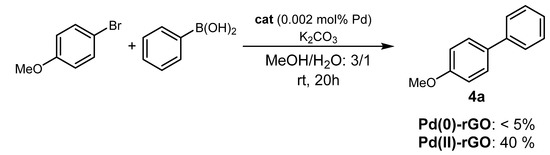 We also studied the activity of Pd(0)-rGO and Pd(II)-rGO in the model Suzuki reaction between 4-bromoanisole and phenylboronic acid under the optimized reaction conditions (0.002 mol % Pd) (Scheme 4). As expected, Pd(0)-rGO was catalytically inactive in the process. On the other hand, Pd(II)-rGO afforded 4a in a 40% yield (Scheme 4). This result ratified the important amphiphilic effect of GO on the Suzuki coupling carried out under aqueous conditions. Palladacycle 1 was also immobilized over rGO following Method B (see SI), but the material thus obtained (1-rGO) only contained a 0.035% of Pd, according to the ICP-OES analysis.