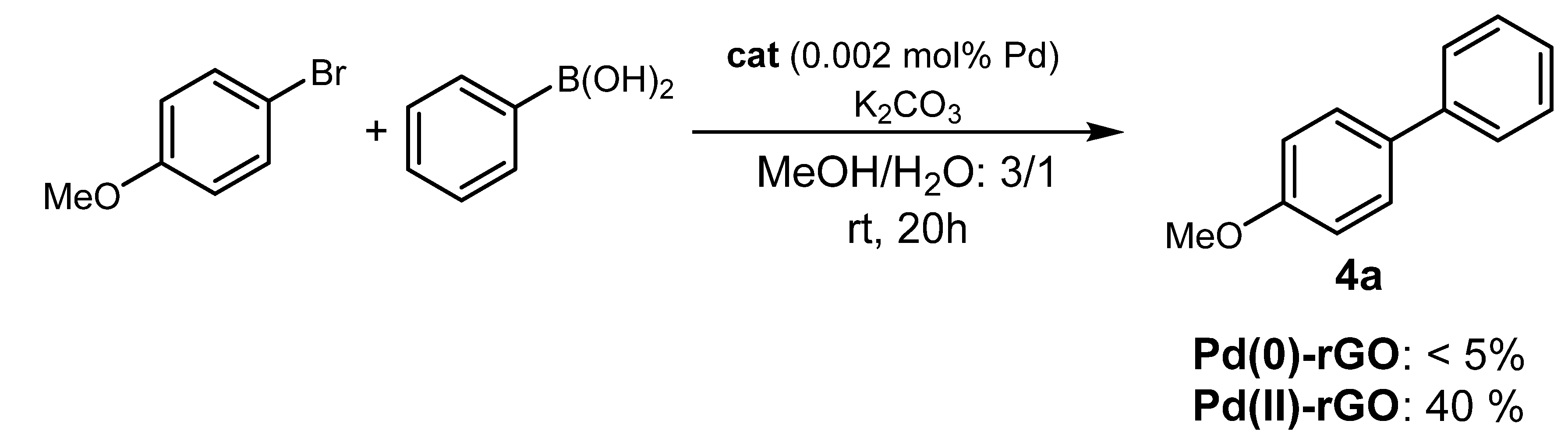 - Gómez-Martínez, M.; Buxaderas, E.; Pastor, I.M.; Alonso, D.A. Palladium nanoparticles supported on graphene and reduced graphene oxide as efficient recyclable catalyst for the Suzuki-Miyaura reaction of potassium aryltrifluoroborates. J. Mol. Catal. A: Chem. 2015, 404, 1–7. [Google Scholar]