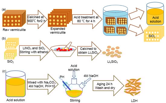 Schematic illustration of the synthesis of Li4SiO4 and LDH from vermiculite, (a) the vermiculite is treated with acid to obtain a silica and an acidic solution, (b) the synthesis of Li4SiO4 from the SiO2 obtained in step (a), and (c) the synthesis of LDH from the acidic solution obtained in step (a).