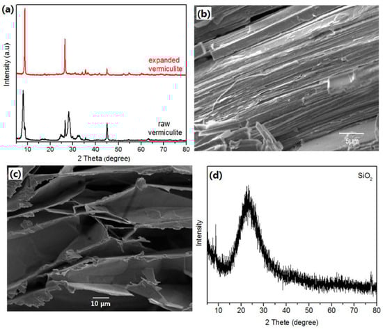 The synthesis process was monitored using various material characterization tools. Figure 2a shows the XRD patterns of VMT and EX-VMT. VMT is a clay mineral consisting of negatively charged silicate layers, with a thickness of about 1 nm. The negative charge arises from the substitution of Al3+ by Si4+ in tetrahedral sites. Before thermal treatment, the raw VMT showed an interlayer spacing of 1.10 nm, and the characteristic d002 reflection peak was observed at 8.02°. This interlayer spacing is slightly narrower than the reported value of 1.44 nm. This phenomenon might be due to the drying in an oven at 100 °C prior to XRD analysis, which caused the partial dehydration of the sample. After thermal treatment at 900 °C, the interlayer distance of the EX-VMT was further narrowed. The characteristic d002 peak shifted to a higher 2θ degree of 8.78°, corresponding to an interlayer spacing of 1.01 nm. This change can be attributed to the loss of the hydration water of the interlayer cations [,]. Figure 2b shows the SEM image of raw VMT, from which the layered structure can be clearly observed, in which all of the layers are tightly packed. However, an abrupt heating of vermiculite at 900 °C induced the exfoliation of VMT, as shown in Figure 2c. In addition, the deformation of the surface of EX-VMT can also be seen, which was due to the spontaneous release of interlayer water molecules []. The XRD pattern of residual solids confirmed that its majority phase was amorphous SiO2 (Figure 2d).