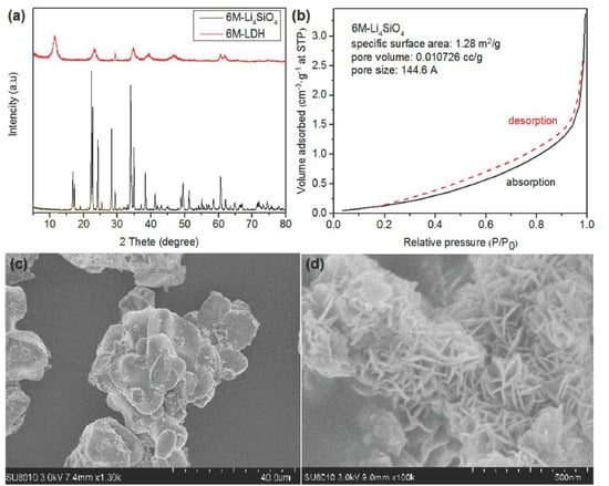 Then, the obtained Li4SiO4 and LDH were also characterized by XRD, BET, and SEM techniques, as shown in Figure 3. The XRD patterns in Figure 3a) clearly indicate that both Li4SiO4 and LDH were successfully synthesized. For Li4SiO4, characteristic peaks at 22.18°, 33.79°, and 38.19°, were observed, which can be attributed to the reflections of −110, 200, and −121 planes. For LDH, the characteristic peaks at 11.68°, 23.53°, 35.61°, 39.62°, and 47.19° were observed, being attributed to the reflections of 003, 006, 009, 015, and 018 planes. The interlayered distance d003 is 0.74 nm, which is similar to the literature reports []. Figure 3b shows the N2 adsorption/desorption isothermal of synthesized Li4SiO4, which suggests that the sample is non porous and that its specific surface area was quite low (1.3 m2·g−1). The morphologies of the Li4SiO4 and LDH samples were studied using SEM analysis, as shown in Figure 3c,d. Li4SiO4 exhibited relatively dense polyhedral particles, which is common for samples synthesized by the solid-state method. The SEM analysis is consistent with the BET result. The Mg-Al-CO3 LDH showed a petaloid structure consisting of a nanosheet [,,,]. The formation of this petaloid-like morphology can be attributed to the synthesis pH of 10. When the pH value equals the isoelectric point of Mg-Al-CO3 LDH, its surface will be close to neutral and the LDH particles will preferably grow into a petaloid structure []. All of the aforementioned analyses indicate that both Li4SiO4 and Mg-Al-CO3 LDH can be successfully synthesized from the vermiculite mineral. In the following section, their CO2 capturing performance will be comprehensively evaluated under various conditions.