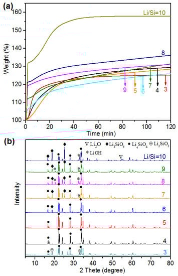 In order to investigate the effect of the Li/Si molar ratio on the CO2 sorption performance, Li4SiO4-based sorbents were synthesized with different Li/Si mole ratios, ranging from three to 10. The SiO2 was obtained from EX-VMT, which was treated with 6 M aqua regia. All Li4SiO4-(EX-VMT)-x (x = 3, 4, 5, 6, 7, 8, 9, and 10) were synthesized by a thermal treatment of 750 °C for 6 h. The CO2 sorption capacities of all samples were evaluated at 650 °C for 2 h, under pure CO2. Figure 4a and Table 2 show that when the Li/Si molar ratio was three, the sorption capacity was relatively low (ca. 25.21 wt %). When the Li/Si molar ratio was increased to four, the CO2 sorption capacity rapidly improved to 30.47 wt %, reaching 93.7% of the theoretical sorption capacity of Li4SiO4 (32.52 wt %). However, when the Li/Si molar ratio was in the range of five to nine, the CO2 sorption capacities did not show any significant increase, and were all around 25.97–36.21 wt %. Some of the values were even higher than the theoretical sorption capacity of Li4SiO4 (32.52 wt %), which is probably due to the formation of Li8SiO6. The following XRD analysis of all of the samples clearly confirms this hypothesis. In particular, when the Li/Si molar ratio was 10, the CO2 sorption capacity sharply improved to 57.93 wt %. However, although the formation of Li8SiO6 can significantly improve the CO2 sorption capacity, its sorption/desorption cycling performance was normally very poor. In other words, due to the even worse reversible CO2 sorption capacity, the formation of Li8SiO6 is normally prevented and Li4SiO4 is preferred.