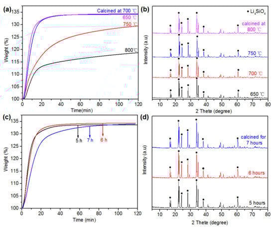 (a) The CO2 sorption performance of Li4SiO4-(EX-VMT)-4 samples synthesized at different temperatures (CO2 sorption was evaluated at 650 °C), (b) XRD patterns of Li4SiO4-(EX-VMT)-4 samples synthesized at different temperatures, (c) The CO2 sorption performance of Li4SiO4-(EX-VMT)-4 samples synthesized at 700 °C for different times (CO2 sorption was evaluated at 650 °C), and (d) XRD patterns of Li4SiO4-(EX-VMT)-4 samples synthesized at 700 °C for different times.