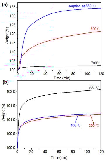 For a practical application purpose, the CO2 sorption capacity of the Li4SiO4-(EX-VMT)-4 sorbent under different operating conditions was investigated. Figure 6a shows the influence of sorption temperature on the CO2 sorption capacity of the Li4SiO4-(EX-VMT)-4 sorbent. The sorbent showed the best sorption performance and the fastest sorption kinetics at 650 °C, with a CO2 sorption capacity of 34.39 wt %. Compared with other Li4SiO4-based sorbents that were also synthesized from cheap SiO2 precursors, the Li4SiO4-(EX-VMT)-4 sample obtained in this research exhibited a higher CO2 capacity [,]. When the sorption temperature dropped to 600 °C, the CO2 sorption capacity of Li4SiO4-(EX-VMT)-4 was only 22.11 wt %, which may be due to the kinetic limitation at a low sorption temperature. However, when the sorption temperature reached 700 °C, the Li4SiO4-(EX-VMT)-4 sorbent displayed almost no sorption capacity (2.51 wt %). This may be due to the activation of CO2 desorption from Li4SiO4 at 700 °C. Considering these findings, it can be concluded that the best sorption temperature for the Li4SiO4-(EX-VMT)-4 sorbent is 650 °C.