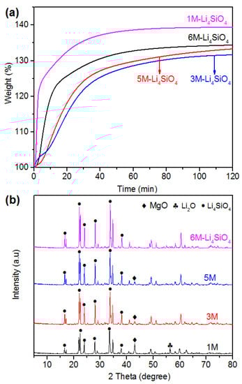 In order to gain a deeper understanding of the influence of the concentration of acid on the CO2 sorption performance, the XRD patterns of Li4SiO4-(EX-VMT)-4 (xM) samples were examined, as shown in Figure 7b. When the concentration of acid was 6 M, the sample only consisted of Li4SiO4. When decreasing the concentration of acid from 5 to 1 M, the MgO phase appeared, which proved that a low acidic concentration will produce impurities in SiO2. Hence, this consequently influences the CO2 sorption capacity of the samples. However, when the concentration of acid was too low, the content of SiO2 became lower, which means that the Li/Si molar ratio was increased. Excess lithium led to the formation of the Li2O phase in the Li4SiO4-based sorbent. Previous studies have confirmed that Li2O has a higher CO2 sorption capacity, but worse regeneration property, than Li4SiO4.