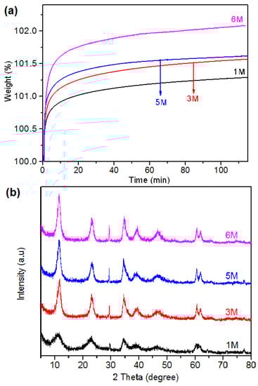 Figure 8a shows the CO2 sorption capacities of Mg-Al-CO3 LDH-xM (x = 1, 3, 5, and 6) samples. It appears that the CO2 sorption capacity gradually increased with an increase in the concentration of acid from 1 to 6 M. For example, with a concentration of acid of 1, 3, 5, and 6 M, the CO2 sorption capacity was 1.3wt %, 1.57 wt %, 1.63 wt %, and 2.08 wt %, respectively. Mg-Al-CO3 LDH-6 M showed the highest CO2 sorption capacity of 2.08 wt % at 200 °C. Figure 8b shows the XRD patterns of Mg-Al-CO3 LDH-xM (x = 1, 3, 5, and 6). All of the synthesized samples formed a typical layered double hydroxide structure. This data suggests that there is no significant difference in their phase structure. The difference in their CO2 capture capacity might be due to the Mg content. As is shown in Figure 7b, when the concentration of acid was low, the Mg element could not be completely leached out from the SiO2. Thus, the relatively lower Mg content in Mg-Al-CO3 LDH-xM results in a lower CO2 sorption capacity.