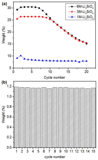 For the practical application of CO2 sorbents, particularly at high temperatures, the CO2 sorption/desorption cycling stability is another important aspect. Thus, the cycling stability of the Li4SiO4-(EX-VMT)-4 (xM) (x = 1, 3, and 6) samples was investigated. Both sorption and desorption were performed at 650 °C for 30 min. Figure 9a shows that when the concentration of acid was 6 M, the cycle stability of the obtained Li4SiO4-(EX-VMT)-4 (6M) was poor. The CO2 sorption capacity started to decline quickly after its seventh cycle, which might be due to the sintering of the sorbent. After 10 cycles, the capacity decreased from its initial 29.37 wt %, to 25.86 wt %. However, with the decrease in leaching acid concentration, the cycling stability of the sorbents was slightly improved. For instance, the decline rate of Li4SiO4-(EX-VMT)-4 (3M) was slower than that of Li4SiO4-(EX-VMT)-4 (6M), and its CO2 sorption capacity started to decline during its tenth cycle. This improved stability might be attributed to the separating and supporting effect from the impurity phases within this sample. This speculation was further confirmed by the result from Li4SiO4-(EX-VMT)-4 (1M). When the leaching acid concentration was as low as 1 M, more impurities remained in the sorbent, thus leading to a decreased CO2 sorption capacity (1.17 wt %). However, it is very clear that the overall stability was improved, without almost any change during the 15 cycles. Thus, these data suggested a promising way to design highly stable Li4SiO4-based CO2 sorbents, by introducing certain inert separating and supporting materials.