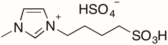 Recently, certain ionic liquids (ILs) have been applied in the processing of cellulose [,,,,,]. Because of their remarkable capacity to delignify and solubilize cellulose, the ILs are often used for pretreating lignocellulosic biomass before hydrolysis [,,,,,]. On the other hand, Davis et al. reported acidic ILs having an acidic group such as a sulfo group in their cationic and/or anionic structures [,,,,], and the acidic ILs exhibit higher catalytic activity in cellulose hydrolysis compared to sulfuric acid []. Furthermore, it has been reported that microwave heating accelerates hydrolysis of cellulose in 1.0 M acidic IL, 1-(1-butylsulfonic)-3-methylimidazolium hydrogen sulfate ([Sbmim][HSO4]; Figure 1) [], because the combination of ILs and microwave is known to exert synergistic effects on several reactions [,,]. In the literature, the glucose yield has increased from a few percent after 30 min to 40% after 12 min at 160 °C when using microwave irradiation.