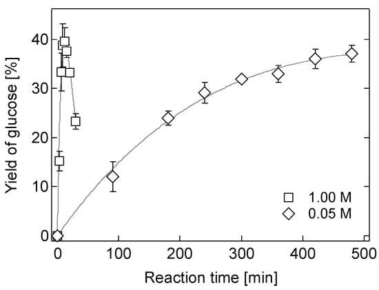Carbohydrates account for 75% of annual renewable biomass. Among the various types of carbohydrates, cellulose is the most attractive because it is inedible and inexpensive; furthermore, it can be obtained on a large scale from biomass (ca. 45% of biomass) []. Recently, the efficient conversion of cellulose to glucose for the production of ethanol and critical building blocks such as succinic acid and gluconic acid via fermentation has been extensively studied [,]. Acidic or enzymatic hydrolysis has been used to obtain glucose from cellulose. Hydrolysis using dilute acid is known to be a simple, cost-effective method; however, it gives low sugar yields and requires a long reaction time []. To improve hydrolysis yield, efficient catalysts are strongly requested.