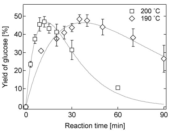 Figure 4 shows the time courses of the glucose yields during bagasse hydrolysis in the 0.05 M [Sbmim][HSO4] solutions at 190 and 200 °C. The reaction rate improved in both cases, compared to that at 160 °C (see Figure 3): peak yields at 190 and 200 °C were obtained after 35 and 12 min, respectively. The glucose yield was also improved by increasing temperature: the peak yields at 190 and 200 °C were 48 and 47%, respectively. We were able to reduce the [Sbmim][HSO4] concentration to decrease the toxicity and improve the glucose yield, compared to the hydrolysis using the 1.00 M solution. In addition, the glucose yield at 180 °C was 43% within 40 min (Figure S4; see Supplementary Materials). Reaction temperatures of greater than 190 °C are favorable for attaining a high glucose yield.