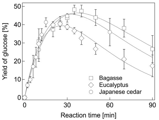Figure 5 also shows difference in the duration for which the maximum yield was achieved (tmax) and the maximum yields (Ymax), depending on the biomass sources. To investigate the reason behind these different values, we measured the crystallinity of biomass. The crystallinity was determined by Fourier transform infrared (FTIR) spectroscopy by calculating the ratio of absorbance at 1437 and 899 cm−1, as reported by O’Connor et al. []. The ratio of absorbance was 0.60 (bagasse), 0.87 (Eucalyptus), and 0.67 (Japanese cedar). Figure 6 shows the relation between the crystallinity of the cellulose present in biomass and tmax and Ymax. As the crystallinity decreased, tmax and Ymax increased, indicating that the crystallinity of cellulose in biomass is confirmed to be a factor in resisting hydrolysis. It also indicates that a higher glucose yield is expected if pretreatments such as ball milling are applied.
