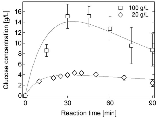 where the initial cellulose concentration is expressed as glucose equivalents. The reaction rate constants, k1 and k2, were determined by fitting Equation (2) to the experimental data according to the nonlinear least-squares method by using Igor Pro software (WaveMetrics, Inc., Portland, OR, USA).