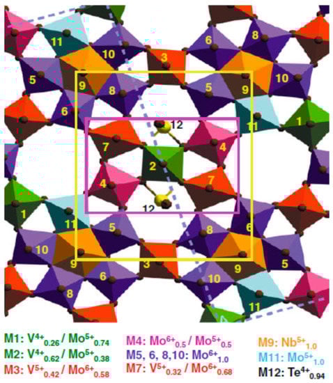 Schematic representation of the structure of M1 along the (001) direction. Green represents NbO7, blue MoO6 and yellow MO6; M = Mo or V. Figure reproduced with permission from [].