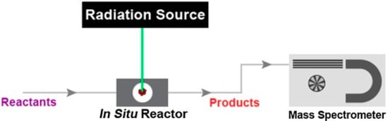 Catalyst structures change depending on reaction temperature, pressure, and time on stream. In order to establish the structure-reactivity/selectivity relationships, which can guide the synthesis of better catalysts, characterization must be done in situ under relevant high-temperature/pressure industrial conditions. In situ cells/reactors are designed so that they can withstand such conditions, while allowing for spectroscopy/microscopy data to be taken through a window. Simultaneous measurements of the reactants and products through MS/GC must also be made to understand the whole reaction phenomena. The term operando (Latin word for ‘working’) was coined by Miguel Bañares in 2002 and operando spectroscopy/microscopy combines an in situ cell with simultaneous online product analysis []. In these in situ and operando applications, the analytical techniques used to analyze surface and bulk catalyst structures, adsorbates, and intermediates include both spectroscopy (Raman, IR, UV-VIS, XAS, XRD, LEIS, XPS, EPR, NMR, neutron diffraction, etc.) and microscopy (SEM, TEM, AFM, etc.) instruments []. These approaches offer several advantages over other characterization techniques. For example, these experiments are directly probing changes of the catalysts when the reaction is occurring and, thus, directly relevant information about the nature of active sites, intermediates, and spectators can be obtained. Although the list of technical possibilities is extensive, the most commonly utilized operando technique in catalysis is IR [,]. A typical experimental setup is shown in Figure 2 []. The key operando results conveyed in the sections below are obtained through XPS, XAS (XANES/EXAFS), Raman. STEM, and XRD techniques.