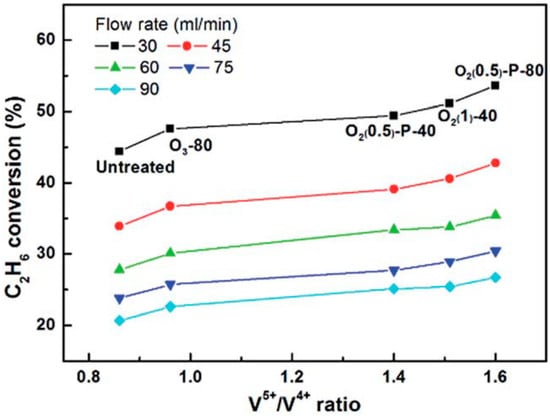 Ethane conversion as a function of V5+/V4+ ratio as measured by XPS and oxygen plasma treatment. Reaction conditions: 400 °C, atmospheric pressure, C2H6/O2/He molar ratio = 30/20/50, W/FC2H6 (W is the catalyst mass and FC2H6 is the ethane molar flowrate) = 20.7–6.91 gcat h mol C2H6. Bulk compositions of catalysts, O3-80 = MoV0.21Te0.25Nb0.09, O2 (0.5)-P-40 = MoV0.22Te0.24Nb0.09, O2 (1)-P-40 = MoV0.21Te0.24Nb0.09, and O2 (0.5)-P-80 = MoV0.21Te0.22Nb0.08. Figure reproduced with permission from [].