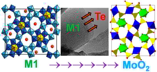 Destruction of the M1 phase through departure of metallic tellurium (Te0) and formation of MoO2 crystals at reaction temperatures of ≥500 °C which results in loss of ODH activity. Red corresponds to Te, yellow to NbO7, blue to MoO6, and light blue to MO6, occupied by both Mo and V cations. Figure reproduced with permission from [].