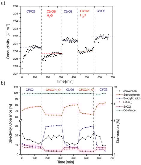 The effect of steam on the electronic and surface structure of the MoVTeNbOx catalyst was studied by Heine at al using operando microwave conductivity, X-ray photoelectron, soft X-ray absorption, and resonant photoelectron spectroscopy under reaction conditions at 350 °C []. As shown in Figure 5, steam increases both activity and acrylic acid selectivity. This result is explained by the fact that steam causes the decrease of electrical conductivity, the increase of the concentration of V+5 and Te+6 and the decrease of Mo+6 on the surface. The catalyst can, therefore, be concluded to act like a semiconducting gas sensor where the bulk conductivity can be used to detect electronic changes on the surface [].