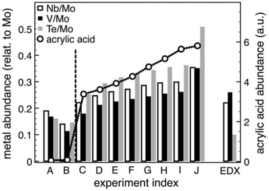 Elemental metal surface composition as determined by operando XPS with the simultaneously-recorded acrylic acid abundance. The MoV0.27Te0.10Nb0.24 catalyst was used and the temperature was increased stepwise from 323 K (50 °C) to 513 K (240 °C), and finally to 693 K (420 °C) during operando XPS measurements. After approximately 10 h TOS in dry feed (C3H8/O2/He = 2/1/2.8 sccm (measurements A and B)), steam has been added (C3H8/O2/H2O (g) = 2/1/2.8 sccm (measurements C–J)). The switch from dry to wet feed is indicated by the dashed vertical line. The bulk composition as obtained by EDX before the reaction is also shown for comparison. Figure reproduced with permission from [].