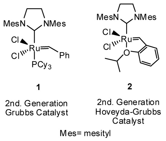- Hong, S.H.; Sanders, D.P.; Lee, C.W.; Grubbs, R.H. Prevention of undesirable isomerization during olefin metathesis. J. Am. Chem. Soc. 2005, 127, 17160–17161. [Google Scholar] [CrossRef] [PubMed]