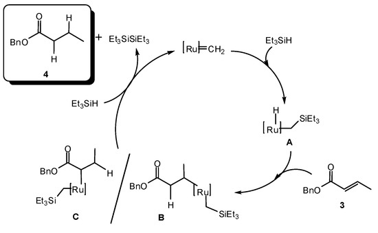Though olefin reduction with Et3SiH activated by Grubbs carbenes is a well-known catalytic process, its mechanism is still not very clear [2,9,39,40]. Cossy et al. have proposed a mechanism that involves the addition of Et3SiH to the Ru carbene to form an active Ru-hydride species (A) (Scheme 1) [9]. Then, species A would give B or C by insertion of 3 into the Ru–H bond. Lastly, B (or C) would suffer an elimination reaction regenerating the ruthenium carbene. In our case, hexaethyldisiloxane was detected in the final crude mixture. Formation of disiloxanes was also reported by Cossy et al. in the same publication [9]. Silanes have weak Si-H bonds and formation of hexaethyldisiloxane can be explained by an oxidation of Et3SiH [41]. It is known that alkyldisiloxanes can be obtained by air oxidation from Et3SiH in the presence of Lewis acids [42]. At the beginning, a radical pathway was considered, since formation of free radicals by changing oxidation state from +2 to +3 in some carbene-ruthenium complexes had been reported [43]. Nevertheless, reaction was unaffected by addition of a radical inhibitor such as di-tert-butyl nitroxide (DTBN), consequently a radical mechanism was ruled out.
